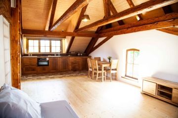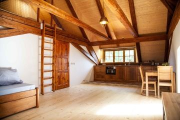 Apartmán se skládá z hlavní obytné místnosti s rozkládací pohovkou a manželského lůžka v patře. Součástí je vybavená kuchyň a oddělená předsíň s úložnými prostory. Koupelna je vybavena sprchovým koutem a WC. Cena pronájmu - 3200Kč/noc.