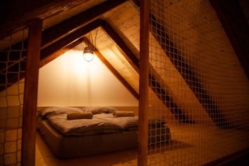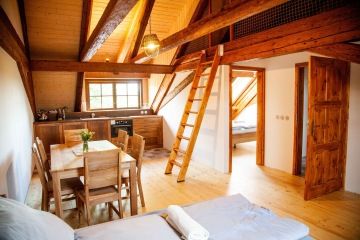 Apartmán 2 se skládá z hlavní obytné místnosti s rozkládací pohovkou, z jedné samostatné ložnice s manželskou postelí a maželským lůžkem v patře. Součástí je vybavená kuchyň a oddělená předsíň s úložnými prostory. Koupelna je vybavena sprchovým koutem a WC. Cena pronájmu - 4600Kč/noc.