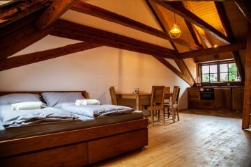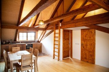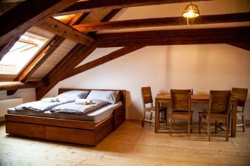 Apartmán se skládá z hlavní obytné místnosti s rozkládací pohovkou a samostatné ložnice s manželskou postelí a manželského lůžka v patře. Součástí je vybavená kuchyň a oddělená předsíň s úložnými prostory. Koupelna je vybavena sprchovým koutem a WC. Cena pronájmu - 4600Kč/noc.